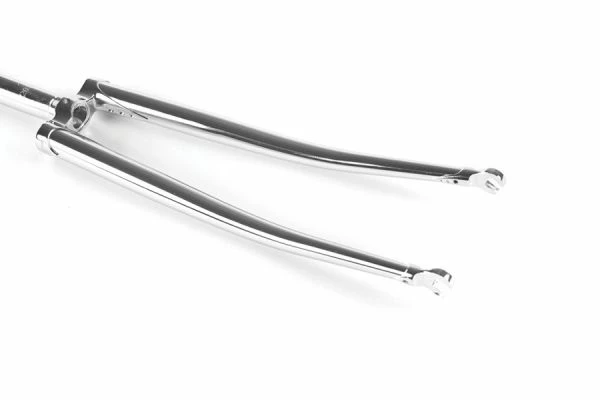 Sehr schöne klassisch gemuffte Bahngabel mit flachen Gabelkronen aus 4130 CroMo. Wahlweise gibt es die Gabel vollverchrohmt, in Schwarz oder Weiß. Wobei die Gabelkrone und die Ausfallenden immer verchromt bleiben. Die perfekte Wahl für einen klassischen Aufbau.