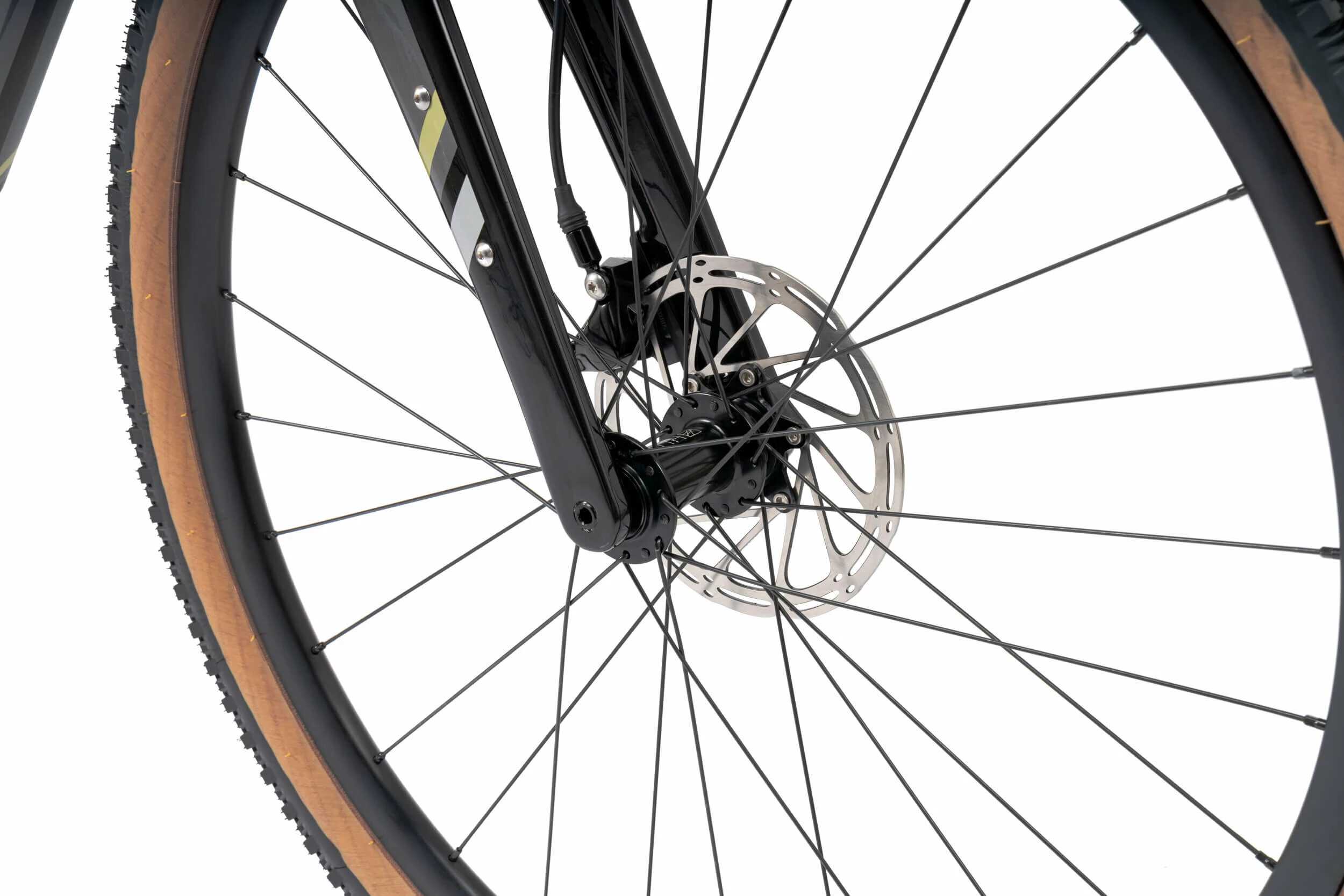 Gebaut aus hochwertigen, Toray T700/T800 Carbonfasern für perfektes Gleichgewicht zwischen Gewicht und Steifigkeit für ausgedehnte und schnelle Graveltouren. Die gerade und extra breite Carbongabel bietet einen Dreifach-Mount und eine 12mm Steckachse. Ausgestattet mit der neuen Bombtrack Lyer 30mm Aluminium Kurbel mit einem 40 Zähne Narrow-Wide (Direct Mount / SRAM Standard) Kettenblatt für perfekte Kettenführung und einer 10-42 Kassette ist jede Steigung möglich – auch mit Gepäck. Sowohl die Reifen, als auch die Felgen sind tubeless-fähig und kommen beide aus dem WTB Werk.