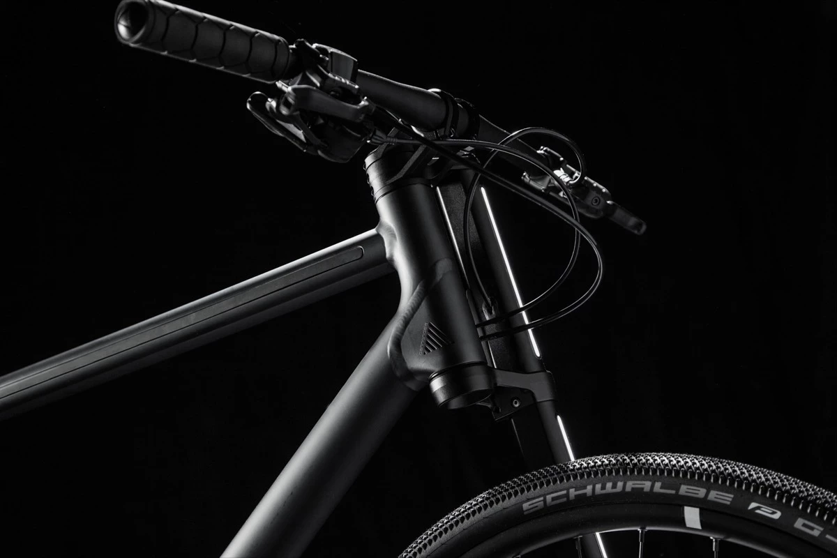 Das einteilig 3D-geschmiedete Steuer- und Unterrohr geben dem neuen Bad Boy einen wertigen, schlichten Look. Schutzblech- und Gepäckträgeraufnahmen sind nach wie vor vorhanden und alle Leitungen verlaufen clean im Rahmen. Im Oberrohr befindet sich ein praktischer, reflektierender Stoßfänger.