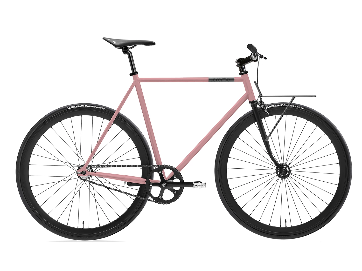 Hochwertiger, WIG-geschweißter Stahlrahmen, gemuffte Stahlgabel, 1” Steuersatz, Felgenbremsen, Aluminiumkurbel, Flip-Flop-Nabe (hinten), Aluminiumpedale, Bahnradfelgen, Edelstahlspeichen, Velo Sattel aus Wildleder, Michelin Dynamic (WMP) / Dynamic Classic (OW) 700X25C Reifen, schmaler Riser Bar