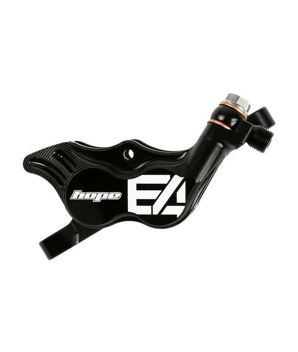 Der E4 Postmount Bremssattel besitzt schwarze Bohrungsdeckel hinter denen 4 x 16mm Bremskolben liegen, welche maximal Bremskraft zusammen mit der legendären Dosierbarkeit von Hope vermitteln. Der Leitungsabgang befindet sich auf der Innenseite des Bremssattels, um das Knicken der Leitung zu vermeiden. Das abgedichtete Entlüftungsnippel sorgt für leichtere Wartung Zur einfachen Handhabung können die Bremsbeläge von oben montiert werden. Für eine super edle Optik und lange Haltbarkeit ist die Bremse komplett eloxiert und mit gelaserten Hope Logos versehen.