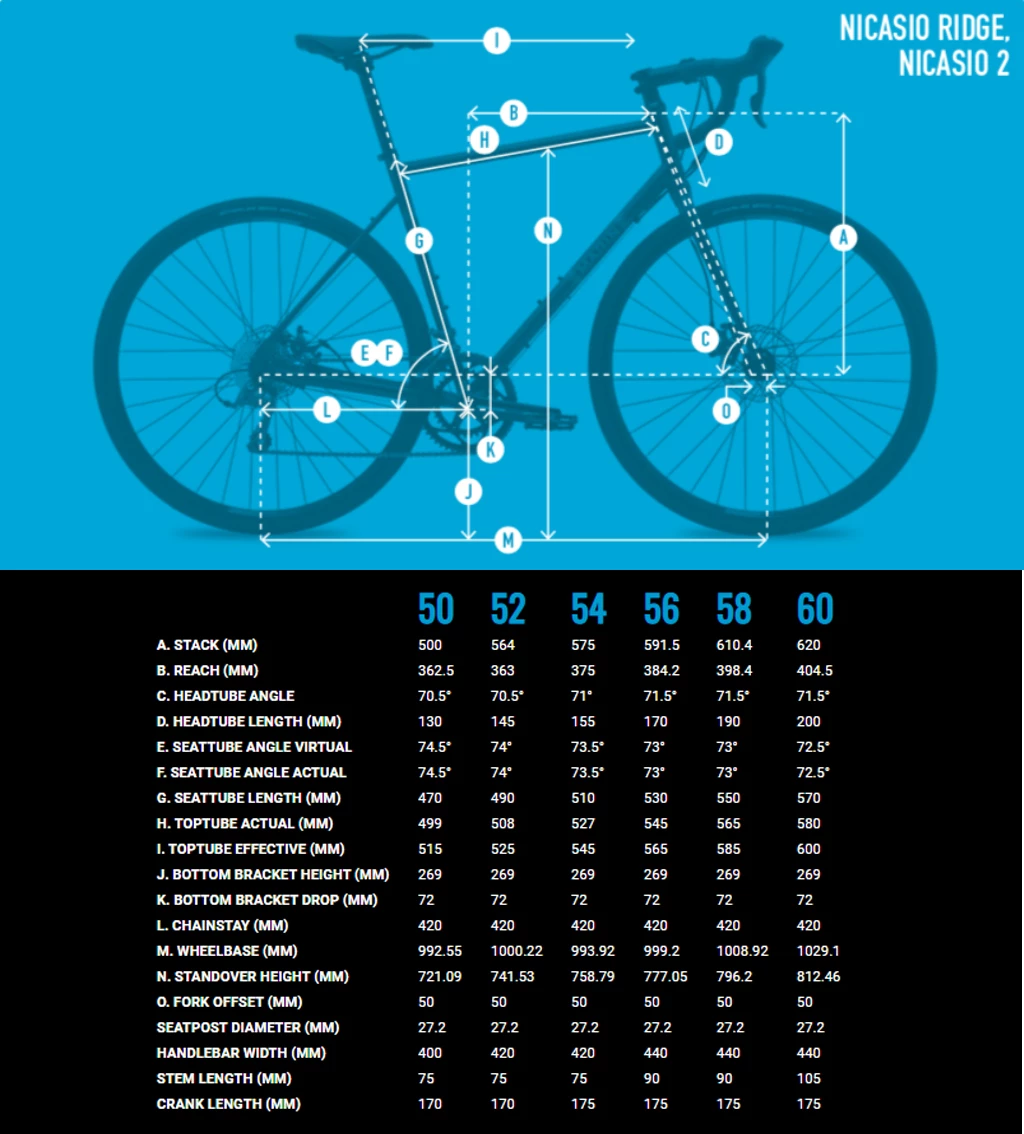 Das Nicasio verwendet Rahmen und Gabel aus konifiziertem 4130er CroMo Stahl, und ist ausgerüstet mit zwei Scheibenbremsen, sowie Aufnahmen für Schutzbleche, Gepäckträger, und zwei Flaschenhalter.